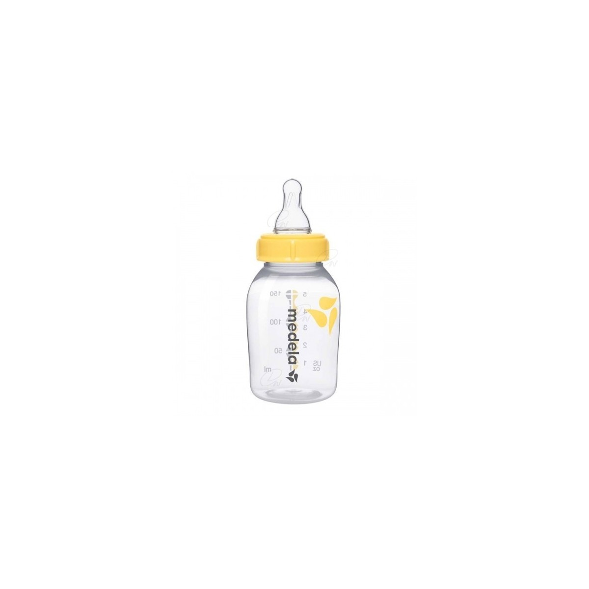 Botella-Biberón Medela con tetina de silicona con flujo lento S, indicada para bebés de 0 a 3 meses. La tetina M está recomendada para bebés de 3 a 6 meses. El biberón está fabricado a base de polipropileno (PP) libre de Bisfenol A. La capacidad es de 150 ml (tetina S) y 250 ml (tetina M). Disponible en un pack completo que contiene la botella-biberón, tetina de flujo lento S, tapón con rosca, disco tapa y cubierta tapón botella.